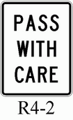 '''Guidance. '''The PASS WITH CARE (R4-2) sign should be installed at the downstream end of a no-passing zone if a DO NOT PASS sign has been installed at the upstream end of the zone. | '''Guidance. '''The PASS WITH CARE (R4-2) sign should be installed at the downstream end of a no-passing zone if a DO NOT PASS sign has been installed at the upstream end of the zone. | ||