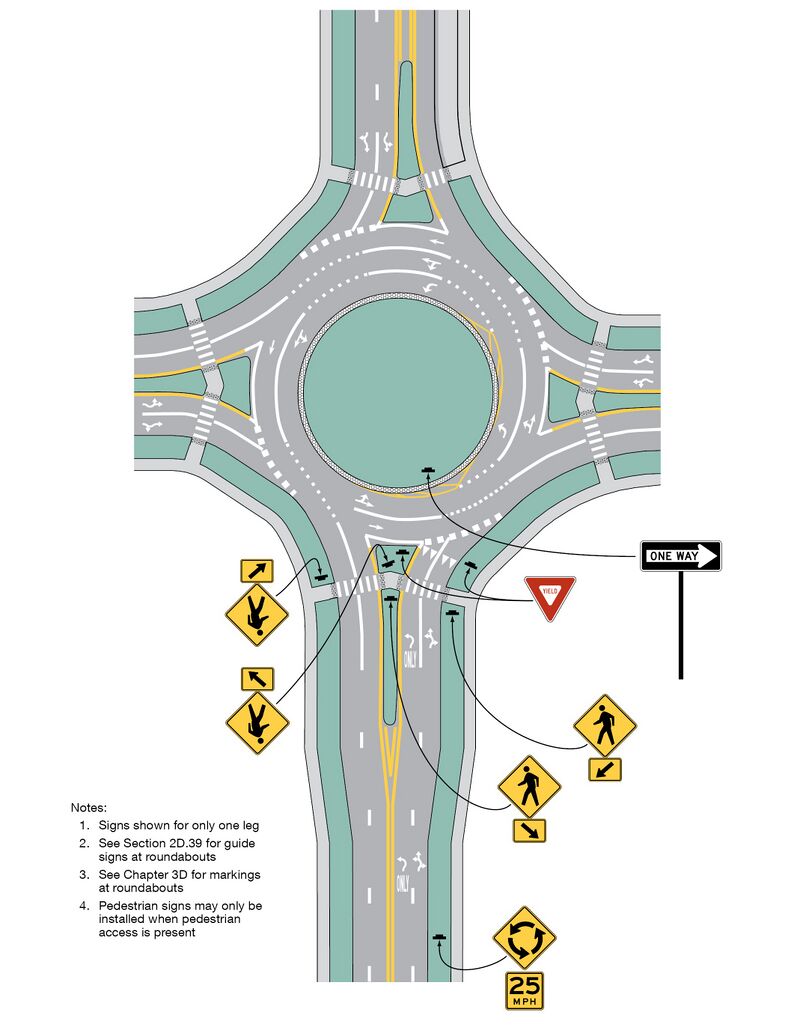 [[File:Fig2B-22_RAB-WarningSigns_v2.jpg|center|thumb|alt=|800px|'''Figure 2B-22''' Example of Regulatory and Warning Signs for a One-Lane Roundabout]] | |||