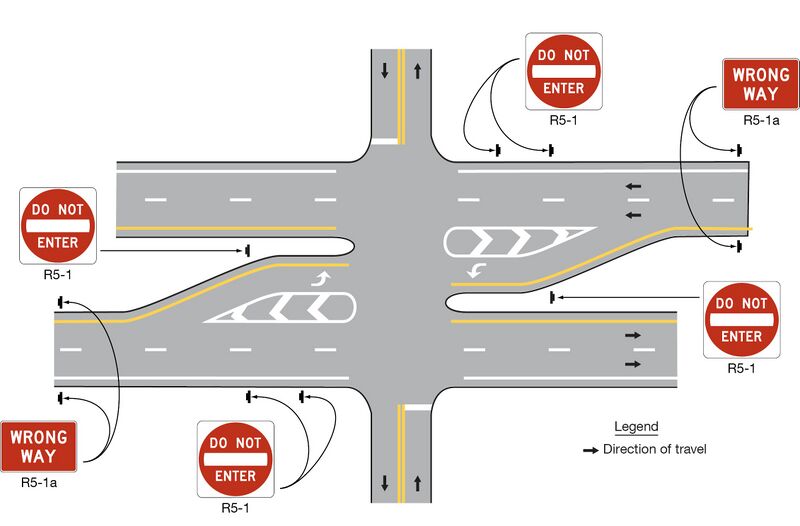 [[File:Fig2B-14_DividedHwayCrossing_v3.jpg|thumb|800px|alt=|center|'''Figure 2B-14 '''Locations of DO NOT ENTER and WRONG WAY Signing for Divided Highway Crossings that Function as Two Separate Intersections]] | |||