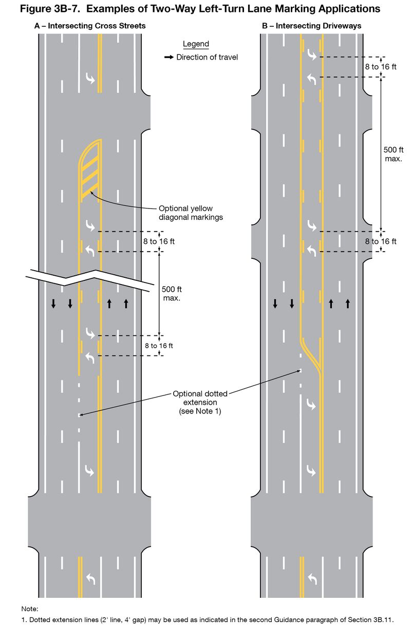 [[File:Fig3B-7_ExamplesOf2WayLeftTurnLaneMarkingApplications.jpg|thumb|center|800px|alt=|'''Figure 620.2.2.2.4''' Example of Two-Way, Left-Turn Marking Applications]]