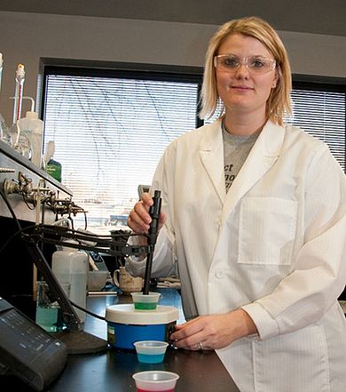 Tracy Adams, Sr. Chemist, calibrates the pH meter to determine the pH (the degree of acidity or alkalinity) of aggregate samples used for backfill. The colored solutions are buffers used in the calibration.