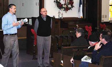 Area Engineer Matt Killion (left) responded to questions from over 100 citizens of Peculiar who were concerned about a bridge project at Rte. J/C and U.S. 71. Mayor Ernest Jungmeyer (right) also fielded questions at the December meeting.
