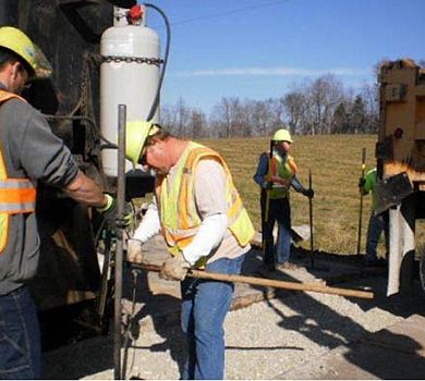 Sr. Maintenance Workers Mike Niemeyer and Allen Cassmeyer, Intermed. Maintenance Worker Harold Johnson and Sr. Maintenance Worker Mark Martin add asphalt to a Rte. 47 trench. They replaced a pipe, filled the trench up to 3"-4" from the top with rock then leveled it off with 3"-4" of hot material. After it settles, they will add more.