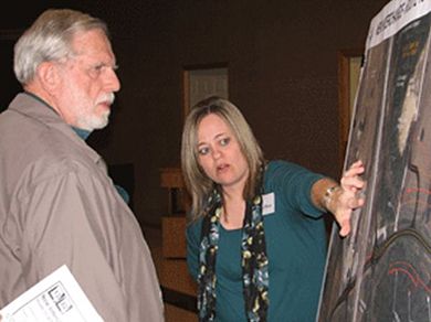 During a public meeting at Osceola, Project Manager Stacy Reese, right, answers a St. Clair County resident's questions about a new interchange at Route 13 and Route 82. Construction on the project is to begin in 2013.