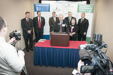 MoDOT Commission Chair Rudolph Farber, backed by Commission Vice Chair Grace Nichols and other dignitaries, presents A Proposal for Missouri’s Transportation Future, a temporary 10-year, one per cent general sales/use tax dedicated specifically to transportation needs. The proposal would give the state, cities and counties resources to make significant progress toward meeting the needs of a total transportation system.