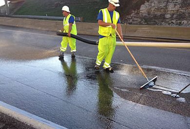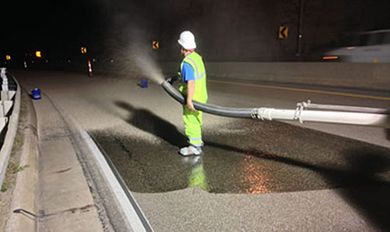 Workers epoxy small gravel to a curve on U.S. 54 at Madison St. in Jefferson City. This $84,000 High Friction Surface treatment will provide motorists more traction in rainy, icy and snowy conditions.