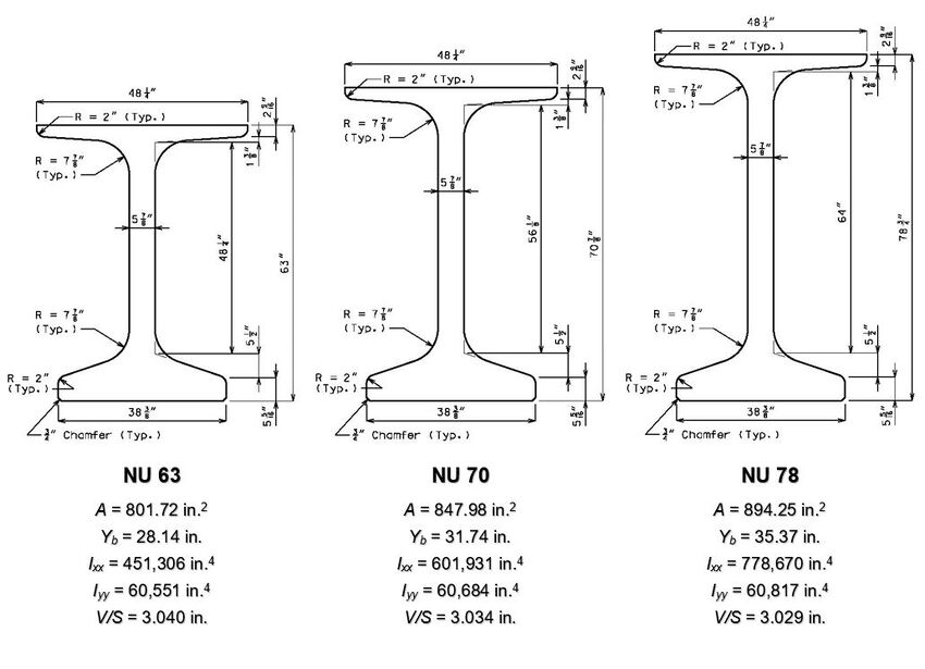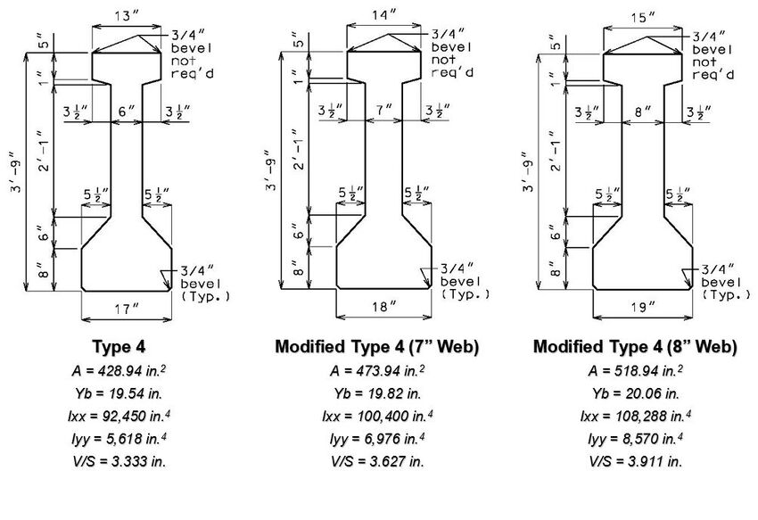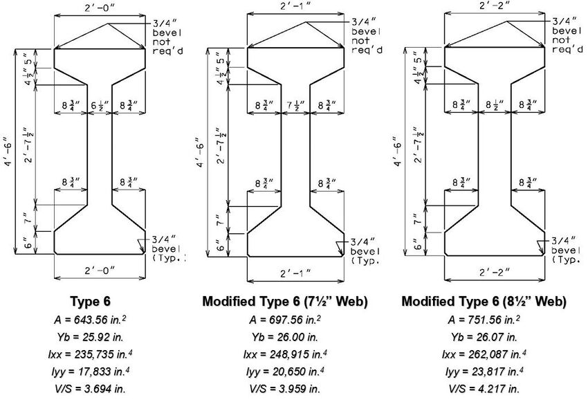 The following sections, except those specified as modified, shall be preferred because of their familiarity to local precast plants. These sections have been entered into the beam section libraries of in-house design software. The top flange height and overall height may be increased if required but any deviation from the standard sections shown shall be discussed with Structural Project Manager or Structural Liaison Engineer. The use of the modified girders shall be discussed with Structural Project Manager or Structural Liaison Engineer.