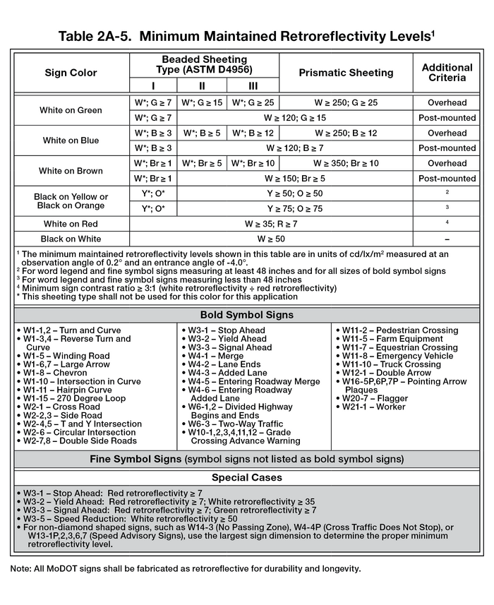 Standard. MoDOT shall use an assessment or management method that is designed to maintain sign retroreflectivity at or above the minimum levels in Table 903.1.?? [MUTCD Table 2A-5]. Local jurisdictions who maintain sections of state routes and the signs on those sections under maintenance agreements shall maintain those signs in accordance with one of the MUTCD assessment methods.