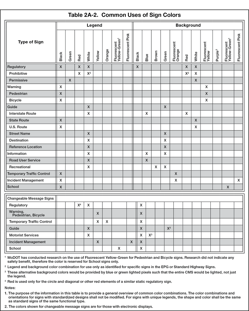 Support. Common uses of sign colors are shown in Table 2A-2. Color schemes on specific signs are shown in the illustrations located in each applicable Article. Whenever white is specified in the EPG or in the MUTCD “Standard Highway Signs” publication (see EPG 900.??? [MUTCD Section 1A.05]) as a color, it is understood to include silver-colored retroreflective coatings or elements that reflect white light.