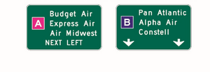 Option. The different colored sign panels on the face of a sign may include a black or white (whichever provides the better contrast with the panel color) letter, numeral, or other appropriate designation to identify an airport terminal or other destination.