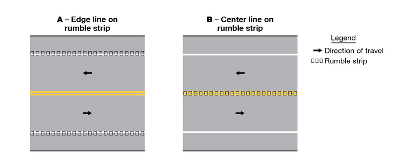 Support. Longitudinal rumble strips consist of a series of rough-textured or slightly raised or depressed road surfaces intended to alert inattentive drivers through vibration and sound that their vehicle has left the travel lane. Shoulder rumble strips are typically installed along the shoulder near the travel lane. On divided highways, rumble strips are sometimes installed on the median side (left-hand side) shoulder as well as on the outside (right-hand side) shoulder. On two-way roadways, rumble strips are sometimes installed along the center line.