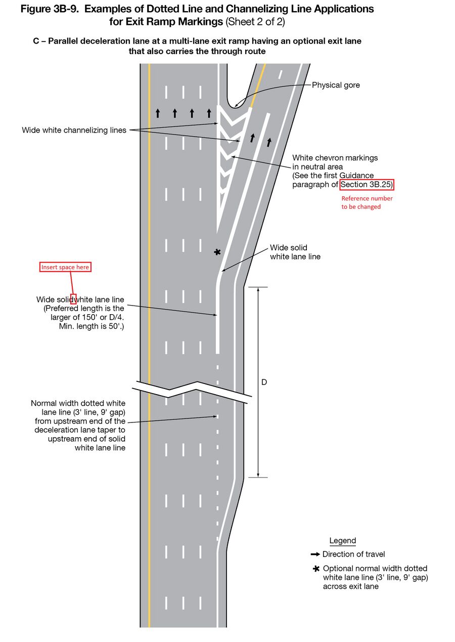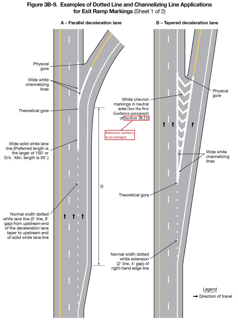 - B. For an exit ramp with a tapered deceleration lane, a normal width dotted white line extension shall be installed from the theoretical gore through the taper area such that it meets the edge line at the upstream end of the taper as shown in Drawing B in Figure 3B-9.