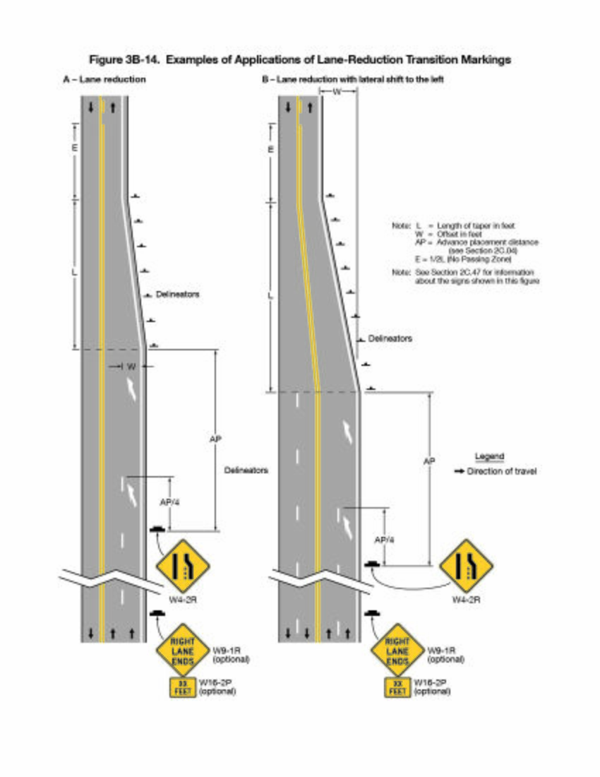 Guidance. The taper length of transition zones should not be less than the taper length calculated using the equations L = WS or L = WS2/60 as defined in 3B.12 Lane-Reduction Transitions. Installation of these markings should conform to the established general patterns.