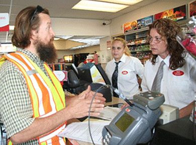 Neosho Senior Construction Inspector Marvin Morris visits with employees at a convenience store to go over traffic pattern changes and other details of the Range Line Rd./I-44 Diverging Diamond Interchange project in Joplin. The store was one of many businesses he visited along Range Line Rd. shortly before construction began Aug. 13.