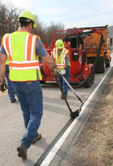 Seasonal Crew Worker Dustin Cutler, left, and Sr. Maintenance Worker Jim Snyder seal pavement cracks on Rte. 82 east of Osceola.