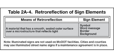In special conditions when illuminated signs are permitted to be used per the EPG, sign symbols, word messages, and backgrounds shall be illuminated by a light behind the sign face through a translucent material . Retroreflection of sign elements shall be accomplished by the means shown in Table 903.1.3.?? [MUTCD Table 2A-4].