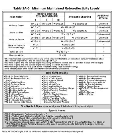 Table 903.1.?? [MUTCD Table 2A-5]. Minimum Maintained Retroreflectivity Levels