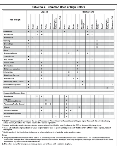Support. Common uses of sign colors are shown in Table 2A-2. Color schemes on specific signs are shown in the illustrations located in each applicable Article. Whenever white is specified in the EPG or in the MUTCD “Standard Highway Signs” publication (see EPG 900.??? [MUTCD Section 1A.05]) as a color, it is understood to include silver-colored retroreflective coatings or elements that reflect white light.