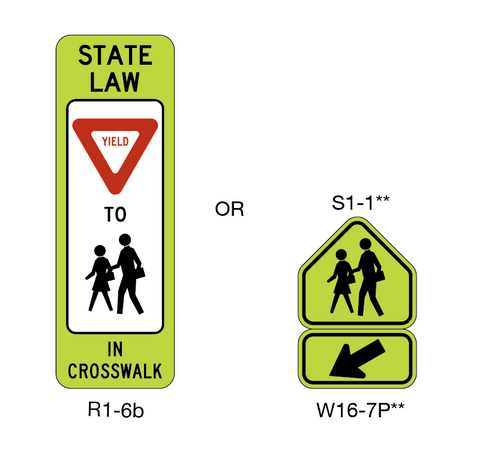 Option. A 12-inch reduced size in-street School (S1-1) sign may be used instead of the In-Street School Crossing (R1-6b) sign at a school crossing on approaches that are not controlled by a traffic control signal, pedestrian hybrid beacon, or an emergency-vehicle hybrid beacon with the approval of the Highway Safety and Traffic Division. A 12 x 6-inch reduced size diagonal downward-pointing arrow (W16-7P) plaque may be mounted below the reduced size in-street School (S1-1) sign.