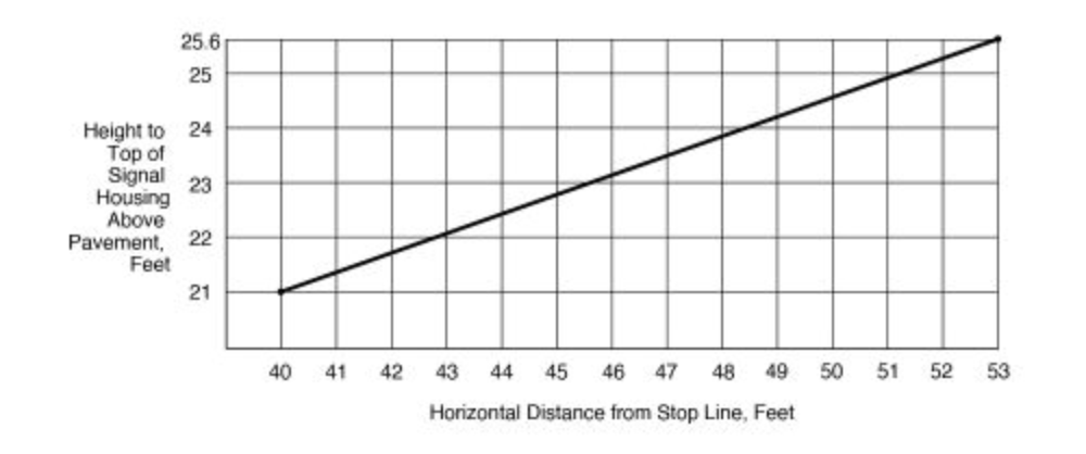 Guidance. For viewing distances between 40 and 53 feet from the stop line, the maximum mounting height to the top of the signal housing of a vehicular signal face located over any portion of a highway that can be used by motor vehicles should be as shown in Figure 902.4.9.