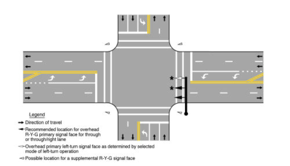 - A. A signal face installed to satisfy the requirements for primary left-turn signal faces (see Sections 4F.02 through 4F.08) and primary right-turn signal faces (see Sections 4F.09 through 4F.15), and at least one and preferably both of the minimum of two primary signal faces required for the through movement (or the major turning movement if there is no through movement) on the approach shall be located: