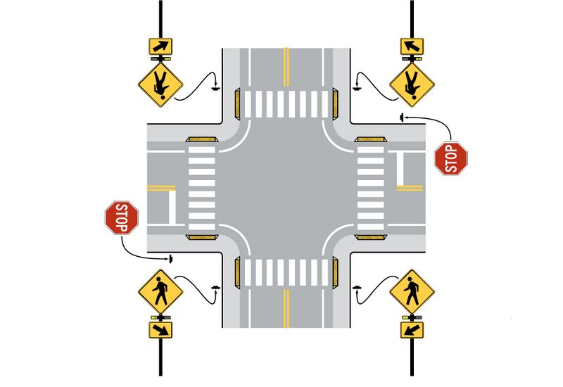 If used at intersections with two crosswalks on an uncontrolled approach, post-mounted RRFBs may be installed to face only one direction of travel at the first crosswalk that traffic encounters (see Figure 902.12.2).