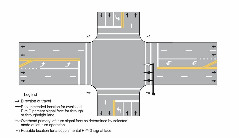 - A. A signal face installed to satisfy the requirements for primary left-turn signal faces (see EPG 902.6.2 through EPG 902.6.8) and primary right-turn signal faces (see Sections EPG 902.6.9 through EPG 902.6.15), and at least one and preferably both of the minimum of two primary signal faces required for the through movement (or the major turning movement if there is no through movement) on the approach shall be located: