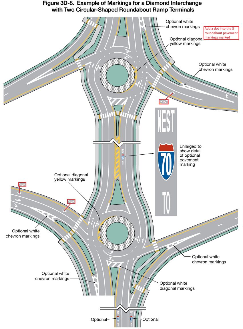Figure 3D-8 Example of Markings for a Diamond Interchange with Two Circular-Shaped Roundabout Ramp Terminals