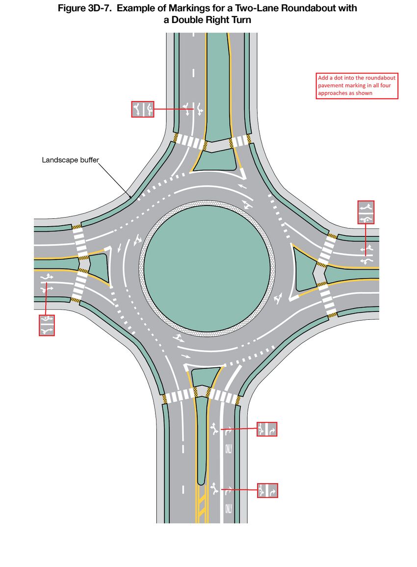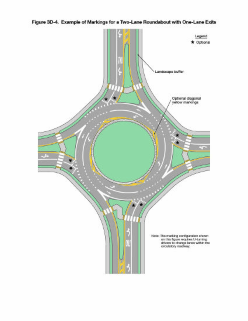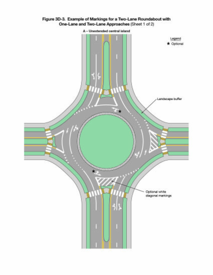 Figure 3D-1 provides an example of the pavement markings for approach and circulatory roadways at a roundabout. Figures 3D-2 through 3D-8 illustrate examples of markings for roundabouts of various geometric and lane-use configurations.