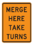 Guidance. The MERGE HERE TAKE TURNS (WO9-2a) sign should be used to identify the merge point at which vehicles from alternate lanes take turns merging during Late Merge applications (see EPG 616.14.19).