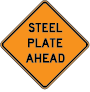 Guidance. When steel plates are used, STEEL PLATE AHEAD (WO8-24) signs should be used to warn road users that the presence of a temporary steel plate(s) might make the road surface uneven and might create slippery conditions during wet weather (see TA-47).