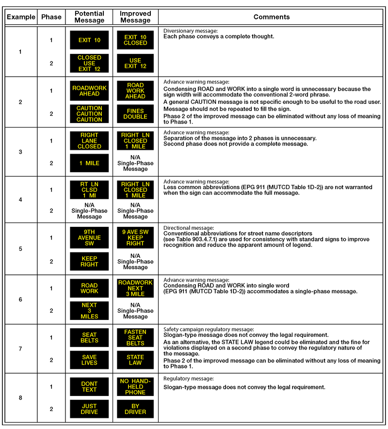 Support. Figures 913.12.5.1 and 903.12.5.2 provide examples of message construction for CMS. Each example shows the message content, layout, and phasing for a potential message and an improved message. The improved message for each example has been optimized for recognition, comprehension, and effectiveness.
