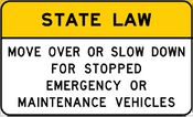 Guidance. The STATE LAW MOVE OVER OR SLOW DOWN FOR STOPPED EMERGENCY VEHICLES sign should be installed on Interstates entering the state at the state line. The location of the sign should be as close to the state line as possible and placed at the discretion of MoDOT.