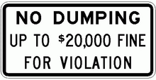 Standard. The NO DUMPING sign (R5-28) shall be erected only at locations where the Department of Natural Resources has given us written notice that solid waste is being disposed of on highway right of way. NO MORE TRASH signs (R5-26) are not typically installed along MoDOT roadways. NO MORE TRASH signs (R5-26) should only be installed at commuter lots, rest areas or roadside parks. NO MORE TRASH signs shall only be installed along the roadway if a major liter issue has been identified and the sign is needed for enforcement purposes. Existing NO MORE TRASH signs (R5-26) shall be left in place until they reach the end of their service life.