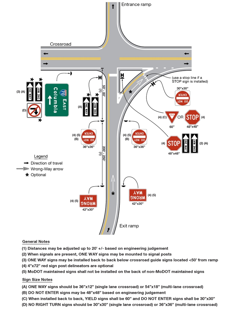 Option. The minimum size for WRONG WAY and DO NOT ENTER signs on ramps facing the opposite direction of travel where a road user could wrongly enter the ramp from a conventional road may be increased to the size in the Conventional Road – Oversized column of Table 903.2.3 when the need for greater emphasis has been determined based on engineering judgement.
